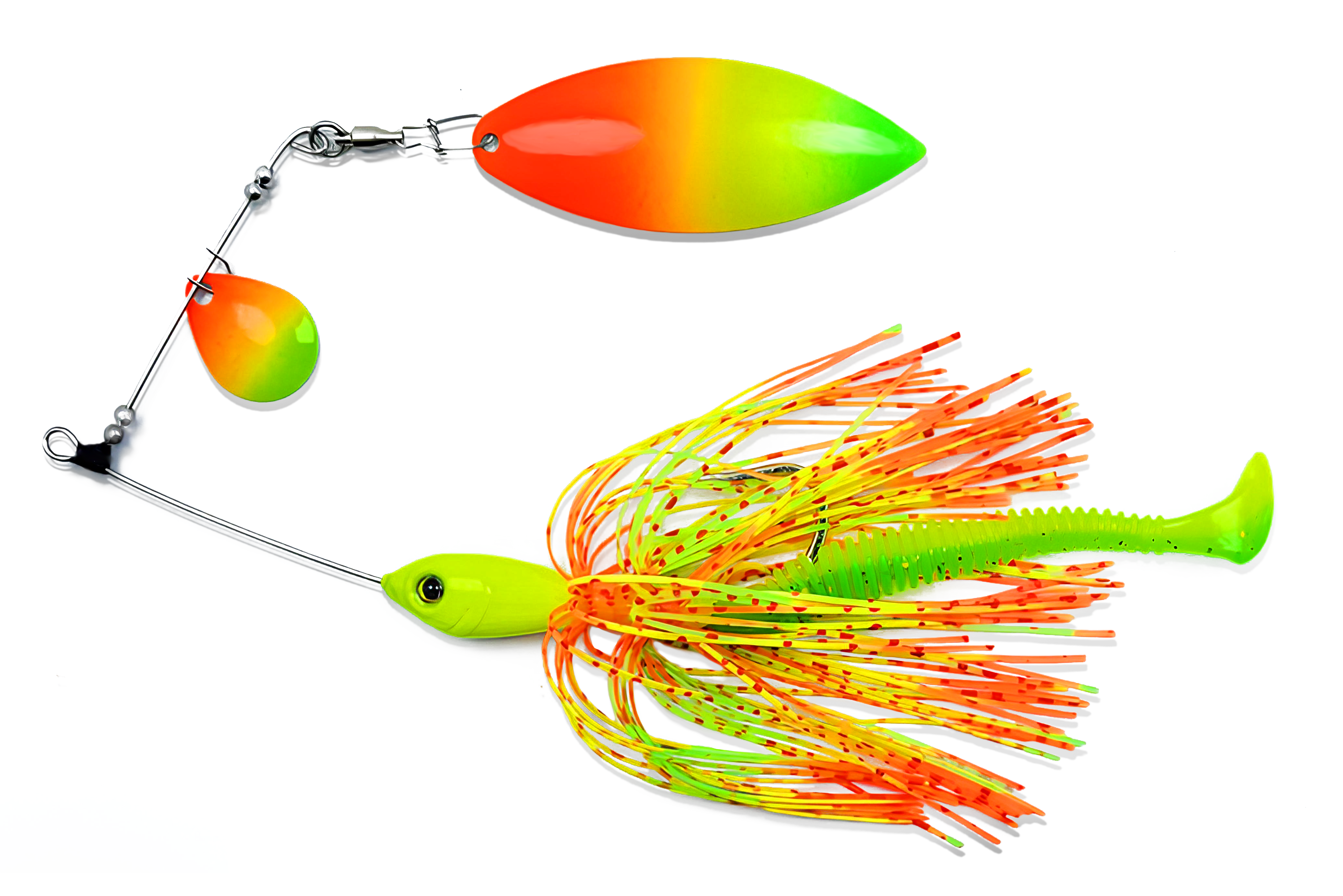 O Spinner Bait Magalhães é uma isca de meia água. Totalmente anti enrosco, feita de chumbo, aço inox, saia de silicone dupla e pintada com cores fluorescentes. Ideal para todos os peixes predadores, como Tucunaré, Traíra, Black bass, Dourado … Ela atrai os peixes pelo intenso brilho e vibração das lâminas em movimento, é extremamente eficiente.